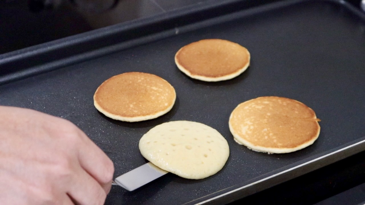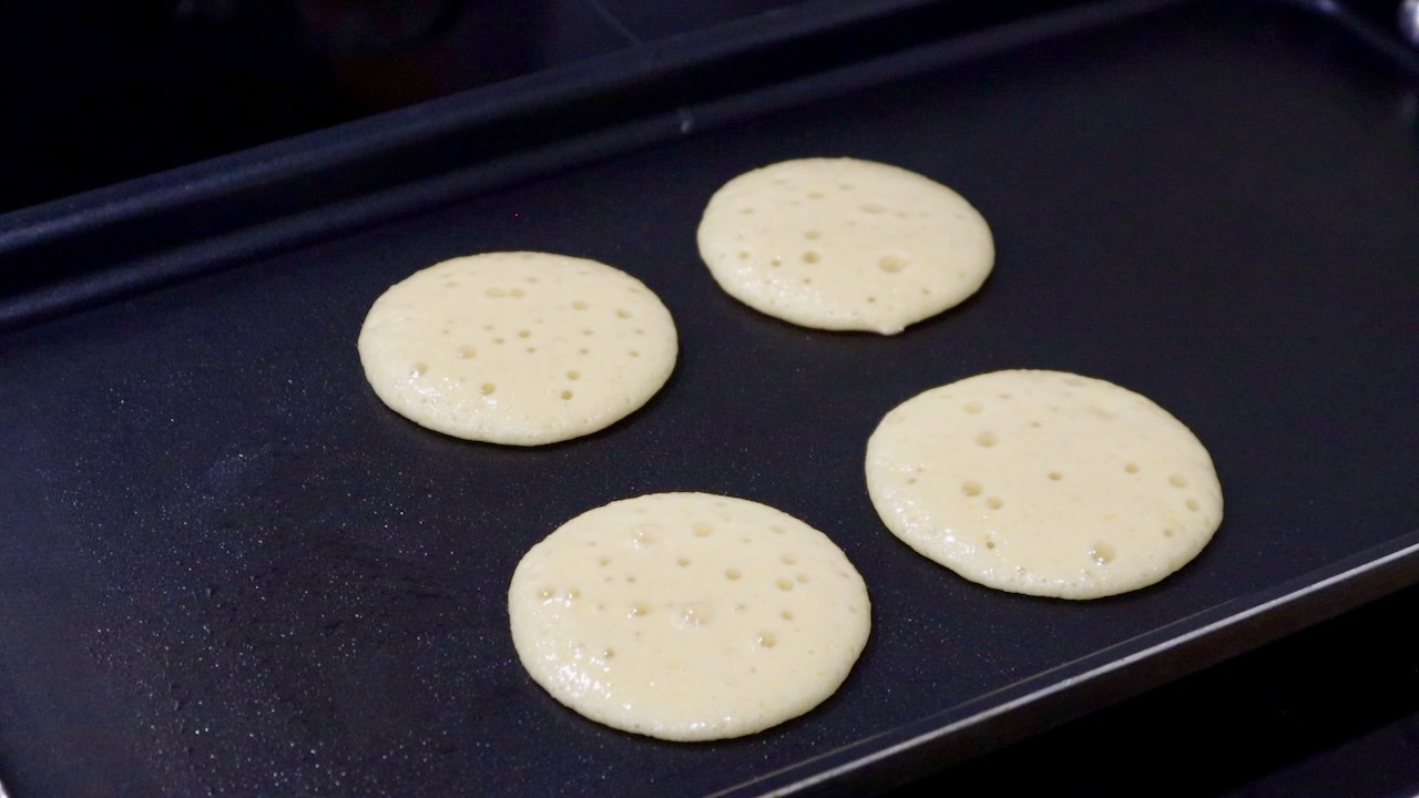 Cook until many bubbles appear on the surface and the edges look dry. Flip and cook the other side for about 1 minute. Repeat with the remaining batter to make about 10 pancakes. Let cool slightly.