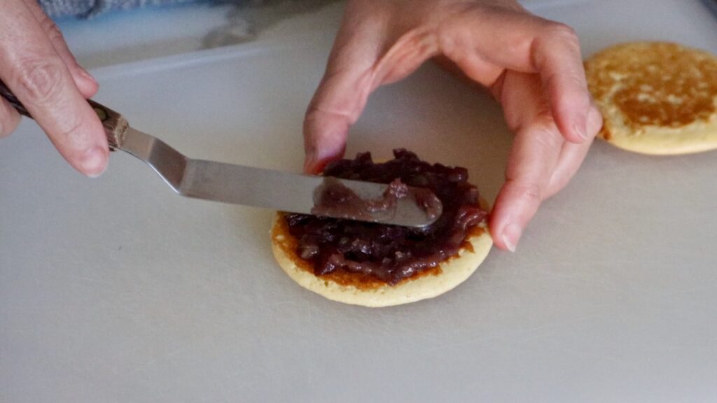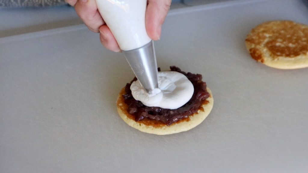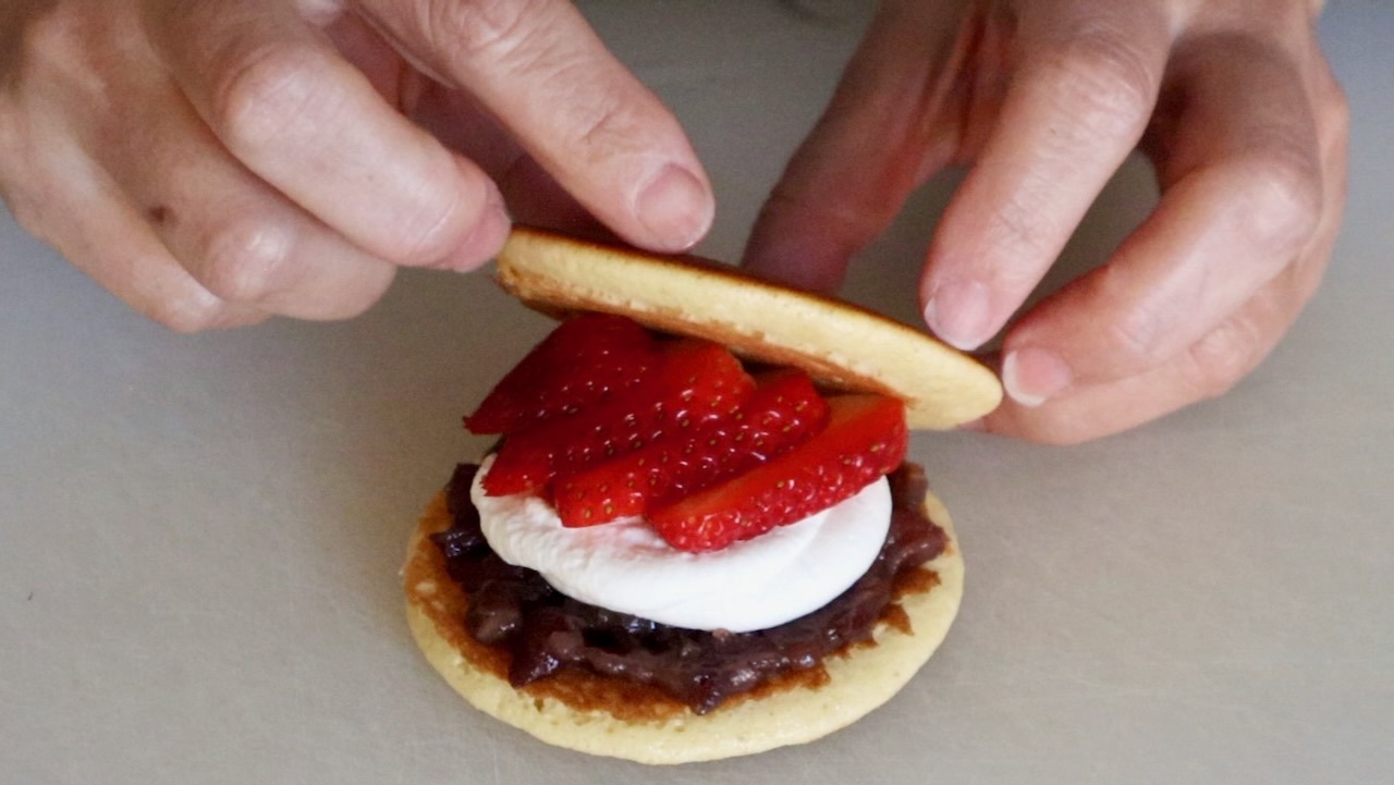 To assemble the dorayaki, spread anko onto one pancake. Pipe whipped cream on top, arrange sliced strawberries over the cream, then sandwich with another pancake.